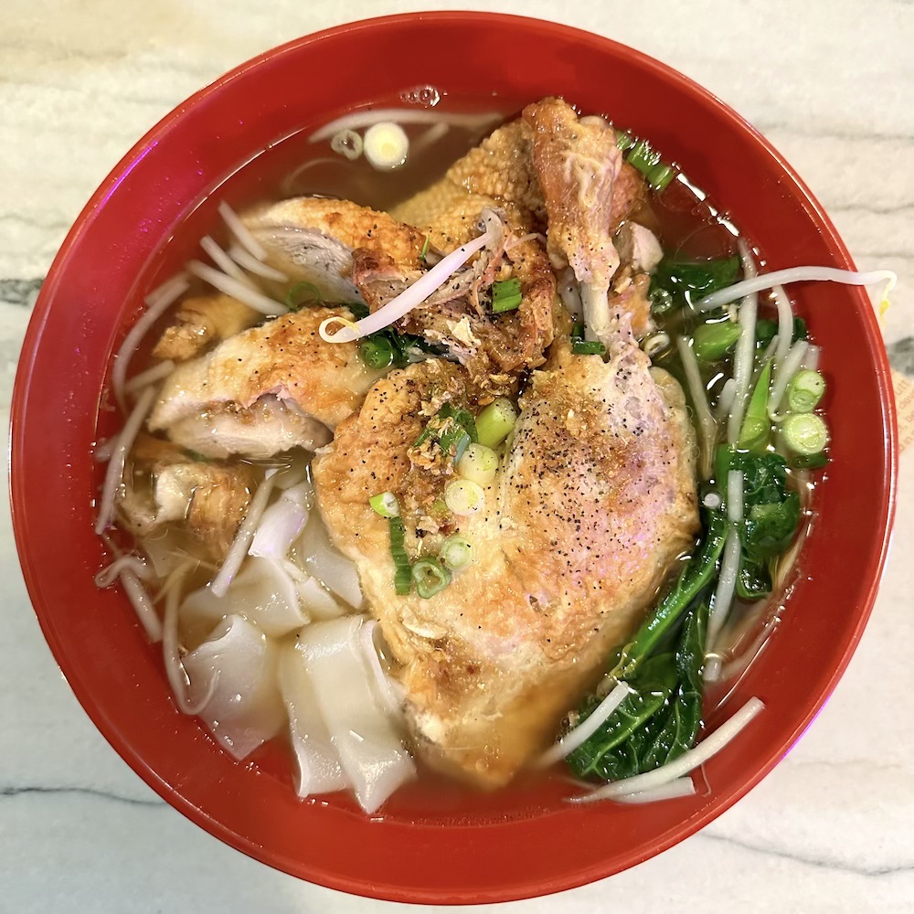 Tender sliced duck served over rice noodle soup, bean sprout, Chinese broccoli, and scallion.